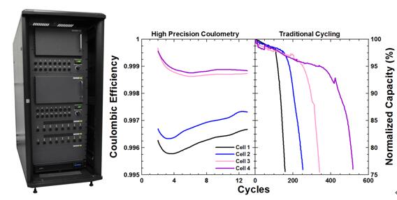2010年,加拿大Dalhousie University的Jeff Dahn教授首次提出通过高精度充放电系统(High Precision Charger)测量库仑效率 。使用正确的设备可以对库仑效率准确测量,从而实现寿命的预测,大大缩短了以往电池寿命测试的时间。市场上的高性能充放电设备的精度通常在0.1%左右。随着锂电池行业的不断发展,高性能电池的库伦效率能够达到0.998以上,尤其初期循环时的CE更接近于1。控制、测量精度为0.1%的充放电设备无法有效的测量与评价不同电池间库伦效率的差异。